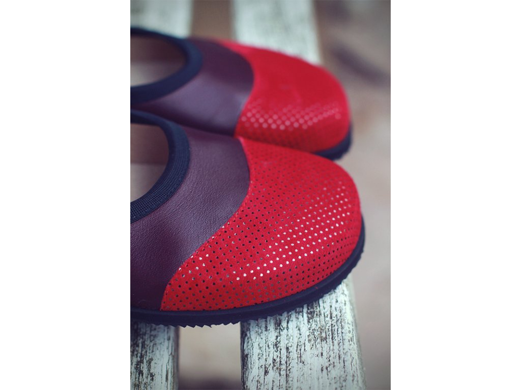 "Karkulkové" barefootové balerínky z hovězí bordó kůže a kozí červené puntíkaté kůže. Pokud někdy ušiji stejné, tak jen pár kousků, takže originalita zaručena:)