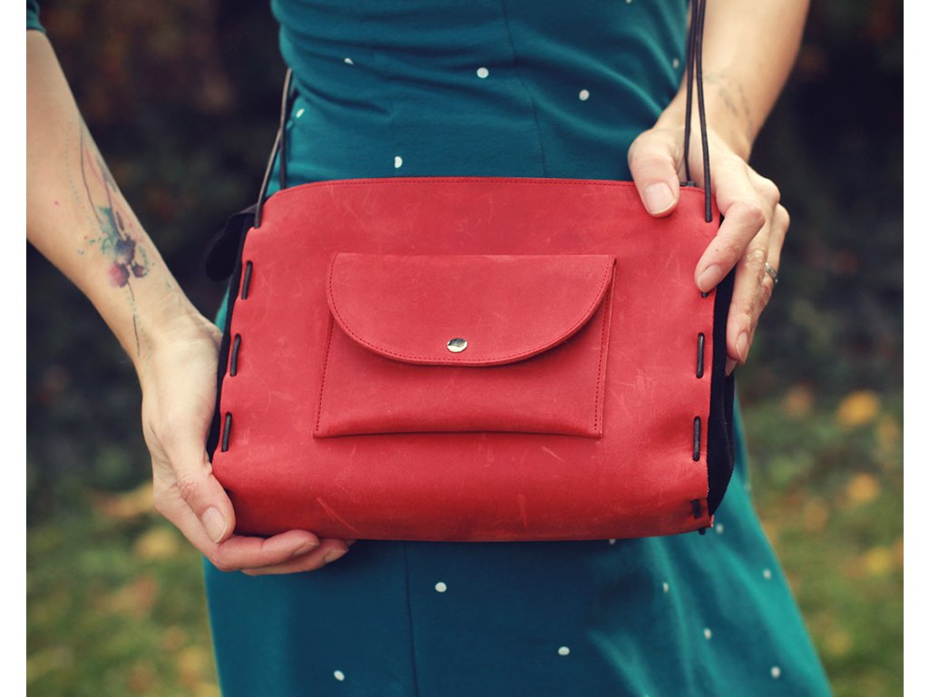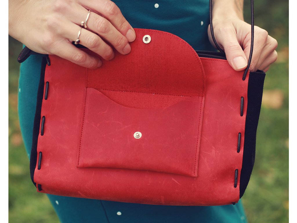 🟡Šmrnc jí dodávají boční strany z broušené kůže, které jsou přišité silnými koženými šňůrami k hlavní kapse kabelky.
